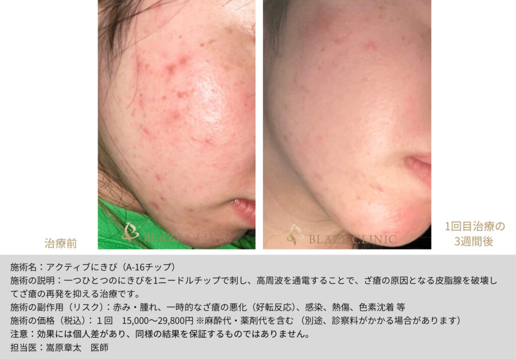 繰り返し同じところに出来るにきびに対して、医師がひとつひとつ丁寧にニードル施術を行っていきます。